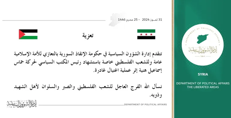 عزت 'إدارة الشؤون السياسية'، الذراع السياسي لـ 'هيئة تحرير الشام'، والتي تعلن تبعيتها لحكومة الإنقاذ، بمقتل رئيس المكتب السياسي لحركة حماس 'إسماعيل هنية' إثر عملية اغتيال قالت إنها 'غادرة'.